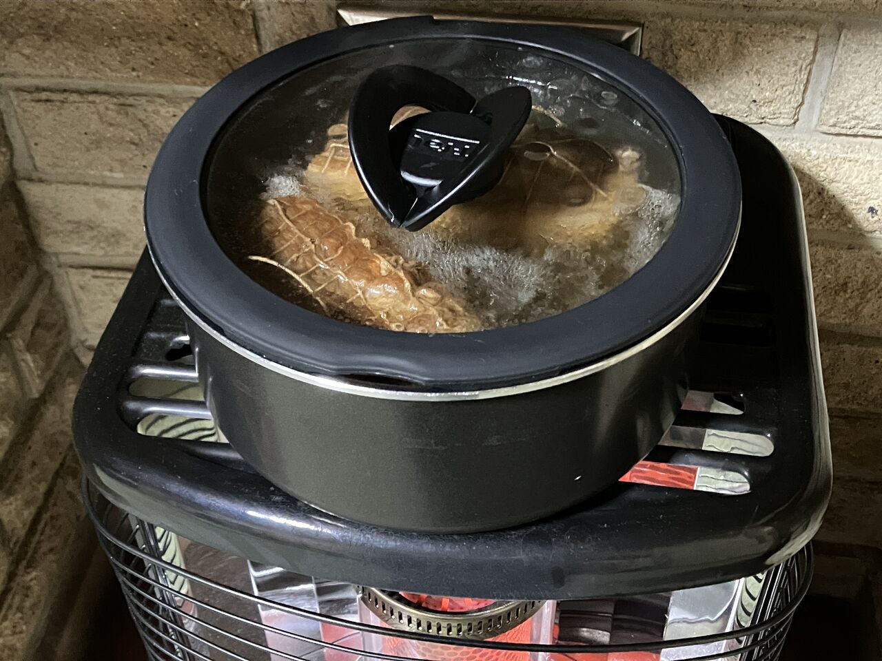 調味料とネギ、生姜、にんにく、にんじんの皮を入れて再度ストーブの上でコトコト。