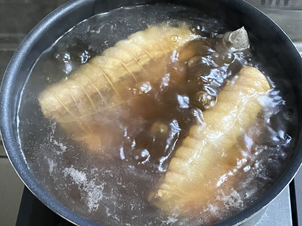 お肉を柔らかくして、臭みを消して、脂っこさを抑えるために紅茶のティーバッグとじっくり煮込む。