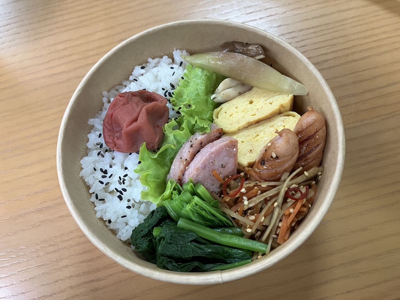 ほうれん草のおひたし・ボロニアソーセージ・きんぴらごぼう・ウインナー・卵焼き・ミョウガの酢漬け