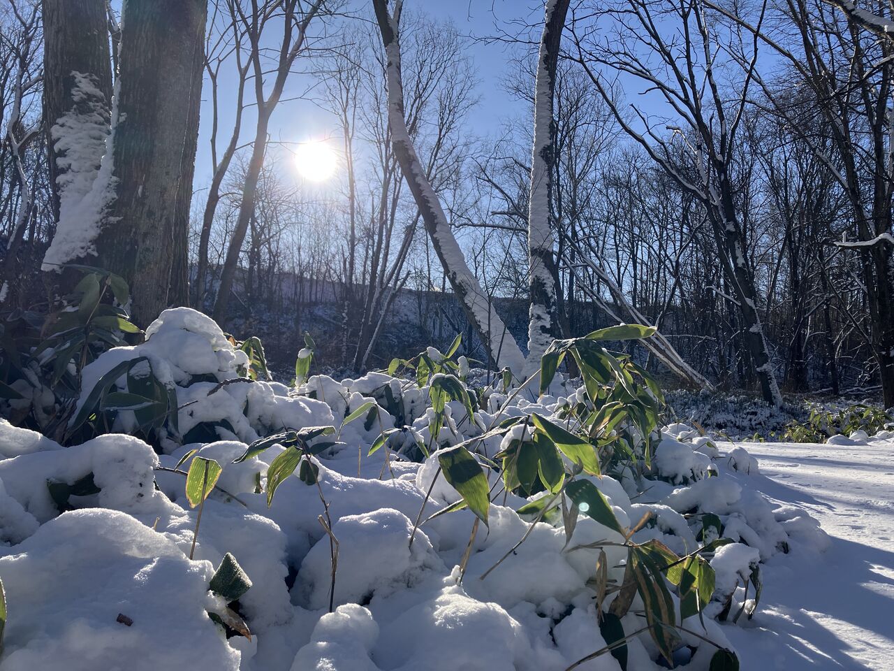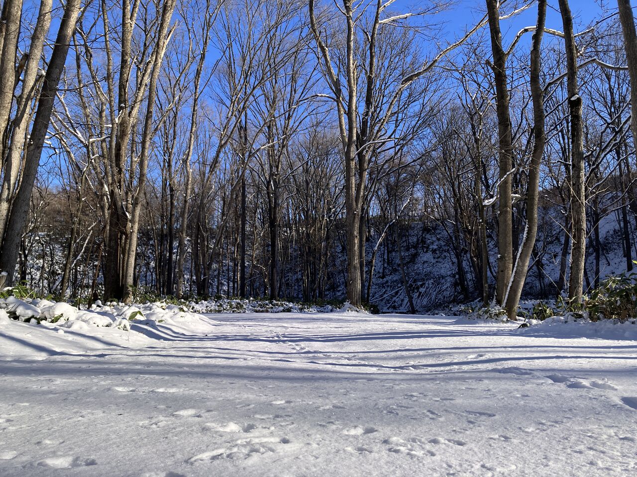 キャンプ場「ふくろうの渓谷」にも雪が積もりました。
