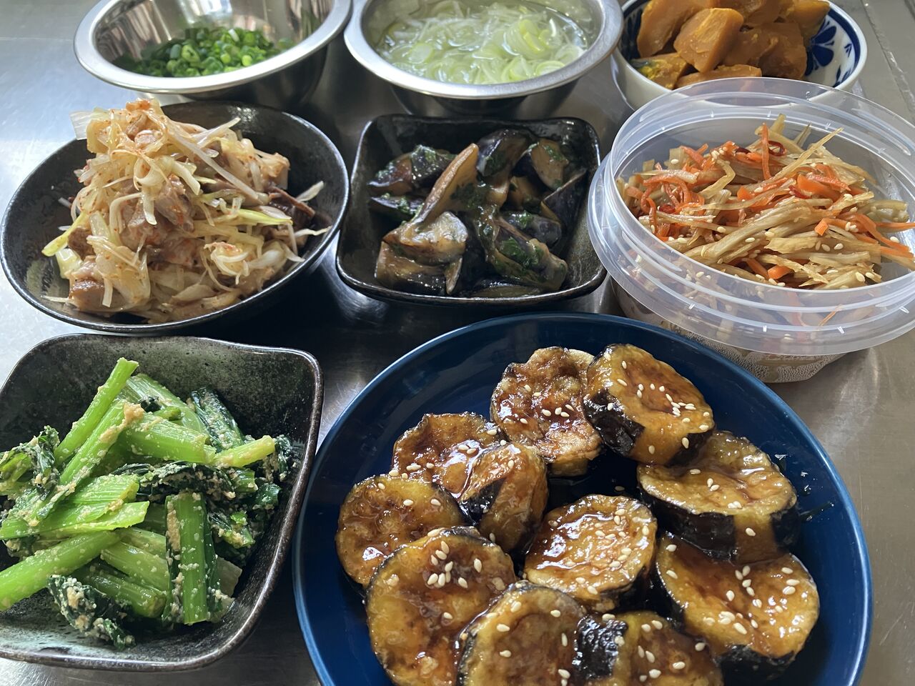 ナスの照り焼き・小松菜胡麻和え・きんぴらごぼう・ナスの大葉味噌・ピリ辛ネギチャーシュー和え・かぼちゃの煮物・薬味など。